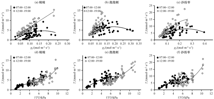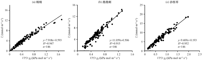 3种灌木叶片蒸腾速率与气孔导度和VPD的关系如图5和表5, 受饱和水汽压差的制约, 上午蒸腾速率和气孔导度的相关性相对较弱, 随气孔导度的增大先升高后降低, 梭梭、 泡泡刺和沙拐枣的蒸腾速率对气孔导度响应的拐点分别为0.171 mol·m-2·s-1、 0.193 mol·m-2·s-1和0.257 mol·m-2·s-1, 下午虽然气孔导度较小, 但饱和水汽压差较大, 受饱和水汽压差的影响, 反而提高了蒸腾速率随气孔导度增加而增大的变化率。蒸腾速率随VPD的升高而增大, VPD在13:00达到峰值之前和之后对蒸腾速率的驱动响应不同, 上午泡泡刺和沙拐枣的蒸腾速率与VPD二次曲线的二项式系数为负数, 对蒸腾速率存在制约作用, 曲线的拐点泡泡刺为7.625 kPa, 沙拐枣为7.667 kPa, 而梭梭没有表现出这种现象, 这表明根系相对较浅的泡泡刺和沙拐枣受到土壤水分的制约, 而梭梭较深的根系受地下水影响, 根系区土壤水分供给相对充足; 下午蒸腾速率与VPD二次曲线的二项式系数为正数, 蒸腾速率随VPD的减小而下降。蒸腾速率对VPD的响应关系随时间变化, 这和植物根-叶水势梯度增大有关 (Zeppel et al, 2004)。3种灌木上午的气孔导度较高但VPD较低, 蒸腾速率主要受VPD的影响, 下午气孔导度降低, 蒸腾速率同时受到气孔导度的制约。大气水势和叶水势的水势差近似于与叶片接触的空气的饱和水汽压差, 其和蒸腾速率以及气孔导度之间的关系可以类比于欧姆定律, 3种荒漠植物Tr和VPD·gs的关系(图6), 均达到了很高的相关性, 说明气孔导度和饱和水汽压差的乘积基本可以解释蒸腾速率的变化。