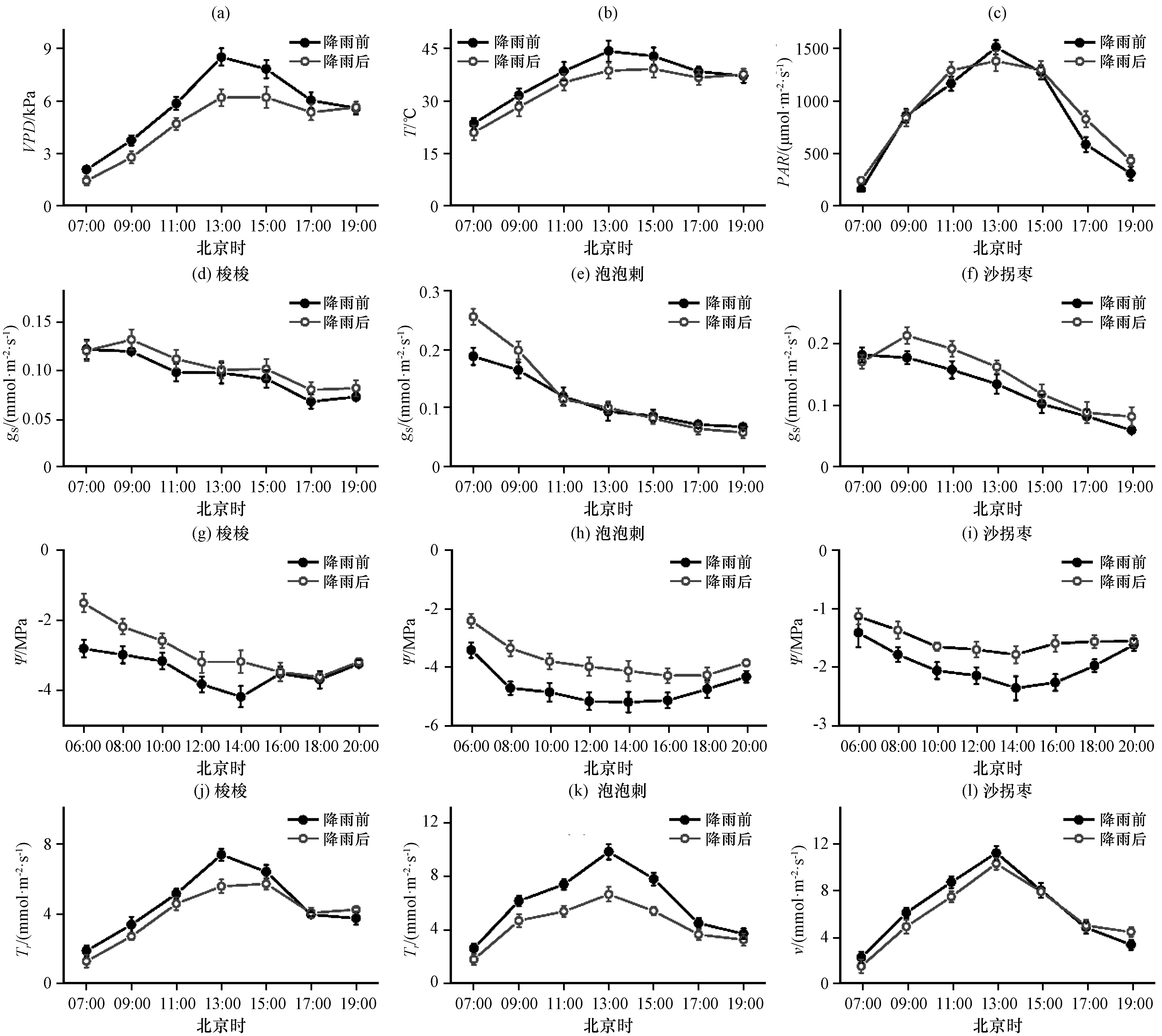 图1 降雨前后饱和水汽压差VPD (a)、 气温T (b)、 光合有效辐射PAR (c)和3种灌木气孔导度gs (d~f)、 叶水势Ψ (g~i)及蒸腾速率Tr (j~l)的平均日变化 |
