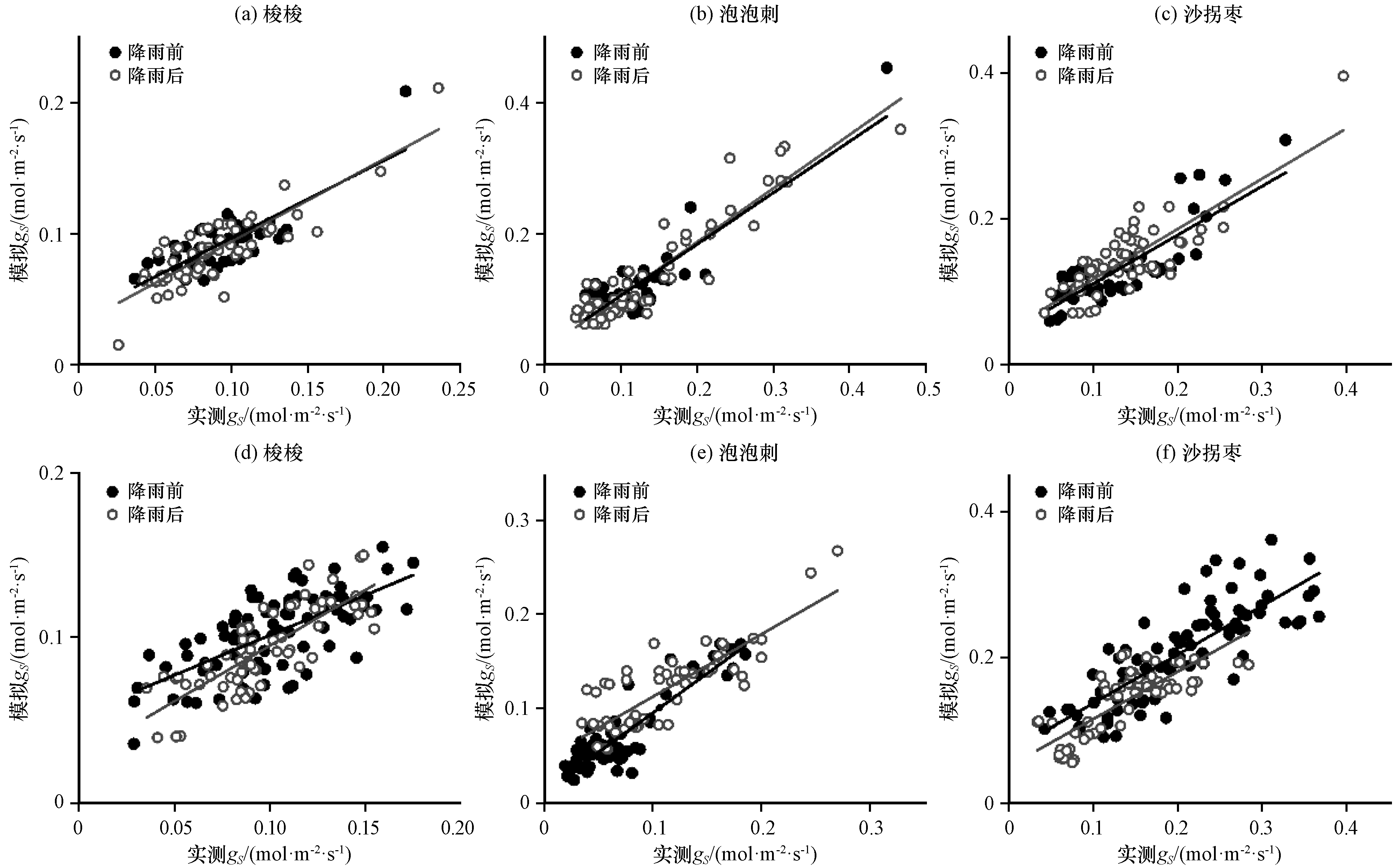 图4 2020年(a~c)和2019年(d~f)3种灌木气孔导度模拟值与实测值比较 |